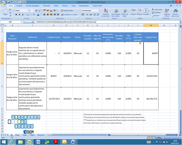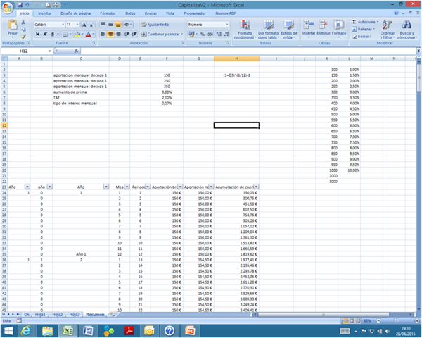 En una pestaña tengo una base de datos con importes/primas, periodos, incrementos de prima porcentual y capital acumulado final a medida que van pasando los periodos/meses. En otra pestaña tengo una especie de formulario que en función de unos datos que introduzco, quiero obtener como resultado ese Valor final (Vf). Por ejemplo: una prima de 150 euros/mes x 12 meses y x 10 años (120 periodos) al un tipo del 2% anual y con un incremento de prima del 3% anual, tengo un Vf resultante de 22.749 euros. El Vf lo intento solucionar con el Indice + Coincidir, pero a la que le pongo más condiciones no me funciona. ¿Me podéis aconsejar cómo resolverlo? Quizás os podría enviar el fichero por si no me he explicado bien. Gracias!