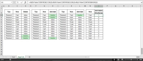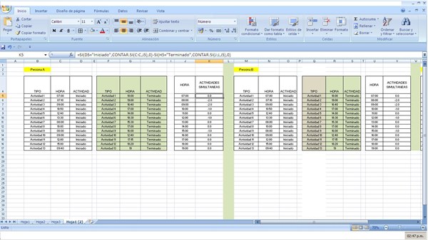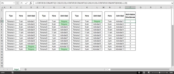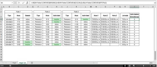 Amigos expertos tengo que preparar una hoja de calculo en la cual yo tengo diferentes personas que realizan actividades a diferentes horas pero quisiera saber si existe alghuna manera de calcular cuantos actividades están realizando al mismo tiempo a cualquier hora que yo requiera: