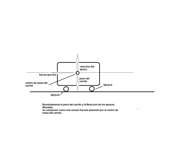 Dibuje: Carro de juguete que ruede por superficie plana al ser alado horizontalmente por una cuerda. Que fuerzas se ejercen sobre el carro, quien o que ejerce esa fuerza, represente las fuerzas en el dibujo.