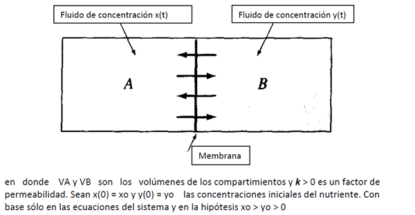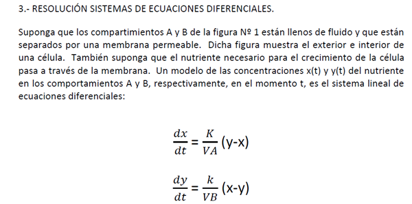 $$\begin{align}&\text{derivo la primera respecto de t}\\&\\&\frac{d^2x}{dt^2}=\frac{K}{VA}\left(\frac {dy}{dt}-\frac{dx}{dt} \right)\\&\\&\text{sustituyo los valores de las ecuaciones}\\&\\&\frac{d^2x}{dt^2}=\frac{K}{VA}\left(\frac k{VB}(x-y)-\frac{K}{VA}(y-x) \right)\\&\\&\frac{d^2x}{dt^2}=\frac{K}{VA}\left(\frac k{VB}+\frac{K}{VA} \right)(x-y)\\&\\&\text{despejo y en la primera ecuación}\\&\\&y=\frac{dx}{dt}·\frac{VA}{K}+x\\&\\&\text{y lo sustituyo donde estábamos}\\&\\&\frac{d^2x}{dt^2}=\frac{K}{VA}\left(\frac k{VB}+\frac{K}{VA} \right)\left(x-\frac{dx}{dt}·\frac{VA}{K}-x\right)\\&\\&\frac{d^2x}{dt^2}=-\left(\frac k{VB}+\frac{K}{VA} \right)\frac{dx}{dt}\\&\\&\frac{d^2x}{dt^2}+\left(\frac k{VB}+\frac{K}{VA} \right)\frac{dx}{dt}=0\\&\\&\text{Es una ecuación lineal homogénea}\\&\text{Con } \;0\quad y\quad -\bigg(\frac k{VB}+\frac{K}{VA}\bigg)\\&\\&\text{raíces de la ecuación característica}\\&\\&x(t)=C_1+C_2e^{-\left(\frac k{VB}+\frac{K}{VA}\right)t}\\&\\&y(t)=\frac{dx}{dt}·\frac{VA}{K}+x(t)=\\&\\&-\frac{VA}{K}C_2\left(\frac k{VB}+\frac{K}{VA}\right)e^{-\left(\frac k{VB}+\frac{K}{VA}\right)t}+ C_1+C_2e^{-\left(\frac k{VB}+\frac{K}{VA}\right)t}=\\&\\&C_1-C_2· \frac{VA}{K}·\frac{k}{VB}e^{-\left(\frac k{VB}+\frac{K}{VA}\right)t}\\&\\&\text{Para que }x(0)=x_0,\;y(0)=y_0\\&\\&x_0=C_1+C_2\\&\\&y_0=C_1-C_2· \frac{VA}{K}·\frac{k}{VB}\\&\\&x_0-y_0=C_2\bigg(1+ \frac{VA}{K}·\frac{k}{VB}\bigg)\\&\\&C_2=\frac{x_0-y_0}{1+ \frac{VA}{K}·\frac{k}{VB}}=\frac{K·VB(x_0-y_0)}{K·VB+k·VA}\\&\\&C_1=x_0-C_2=\frac{k·VAx_0+K·VBy_0}{K·VB+k·VA}\end{align}$$