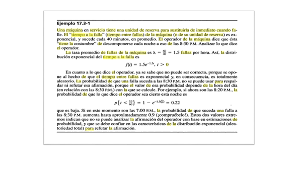 Una máquina de servicio tiene una unidad de reserva para sustituirla de inmediato cuando falle. El "Tiempo a la falla" (tiempo entre fallas) de la máquina (o de su unidad de reserva) es exponencial, y sucede cada 40 minutos en promedio.