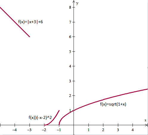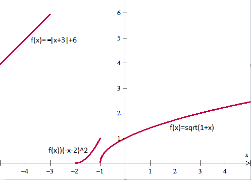 x)= Abrimos una llave -barra absoluta dentro de ella x+3, cerramos la barray fuera de ella +6 si x menor o igual a -3, siguiente ecuacion(-x-2)al cuadrado si -2menor o igual axmenor a -1 y -raiz cuadrada con subindice radical x+1 si x mayor a -1