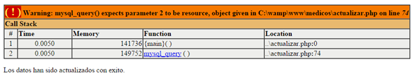 $noexpint = trim($_POST['noexpint']); $ta = trim($_POST['ta']); $temp = trim($_POST['temp']); $query = "UPDATE consultas SET ta='$ta', temp='$temp' WHERE noexpint = '$noexpint'"; echo " <p>Los datos han sido actualizados con exito.</p>";