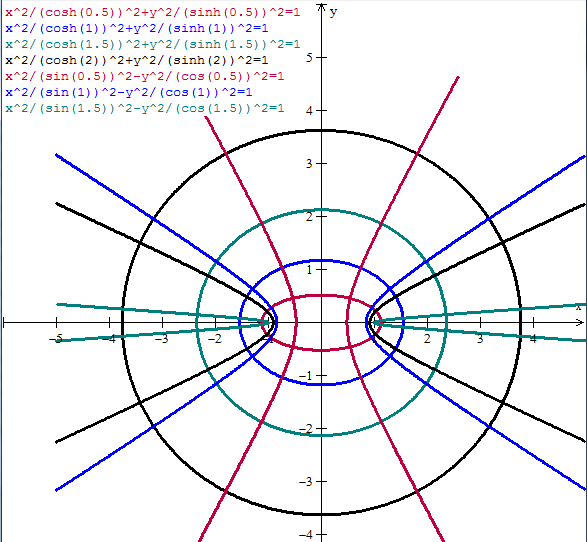 $$\begin{align}&u=\cos \,t·cosh\,k\\&v= sen \,t·senh \,k\\&\\&\text {Esto es una elipse centrada en el origen}\\&\\&\frac{u}{cosh\,k}=\cos t\\&\\&\frac{v}{senh \,k}=sen\,t\\&\\&\text{elvándolas al cuadrado y su}\text{mándolas}\\&\\&\frac{u^2}{cosh^2k}+\frac{v^2}{senh^2k}=1\\&\\&\\&\text{Si es una recta vertical x=k}\\&\text{tiene los puntos (k,t) }\forall t \in \mathbb R\\&\\&u=\cos \,k·cosh\,t\\&v= sen \,k·senh \,t\\&\\&\text{que es una hipérbola}\\&\\&\frac{u}{cosk}= cosh\,t\\&\\&\frac{v}{senk}=senh\,t\\&\\&\text {elevanto al cuadrado y restando}\\&\\&\frac{u^2}{\cos^2k}-\frac{v^2}{sen^2k}=cosh^2t-senh^2t=1\end{align}$$