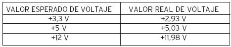 Los valores reales de voltaje no pueden variar más del 5% del valor de voltaje esperado si hablamos de los voltajes de +3, 3 V y +5 V. Para el valor de +12 V el valor real no puede variar más del 10% del valor de voltaje esperado.