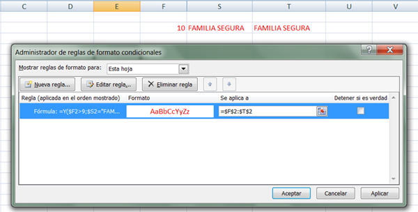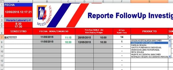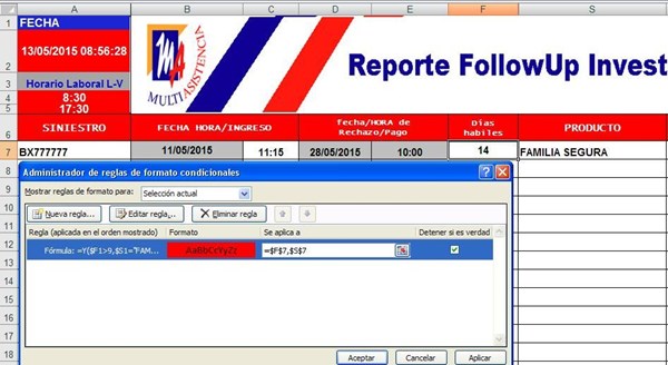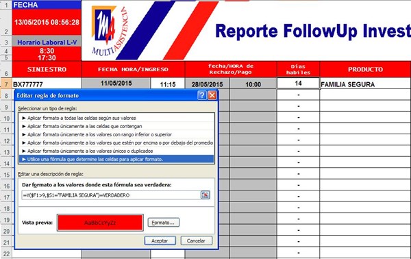 Al elegir "Ayuda Hospitalaria" de las opciones de mi lista desplegable la fórmula verifique si el caso tiene más de 10 días y si esto es así que aplique color rojo para indicar que el caso esta fuera de tiempo .