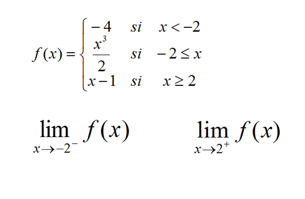 Limite cuando por tiende a 2 derecha, limite cuando por tiende a -2 izquierda hallar, abrimos una llave y luego colocamos dentro de la llave -4 si x<-2, en la siguiente linea x al cubo/2 si -2 menor o igual a x < 2 y x-1 si x mayor o igual a 2, espero me ayude