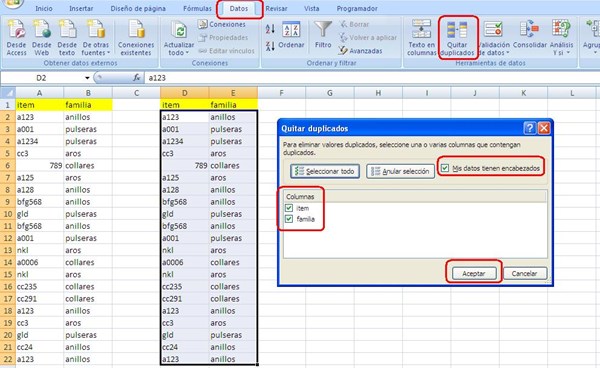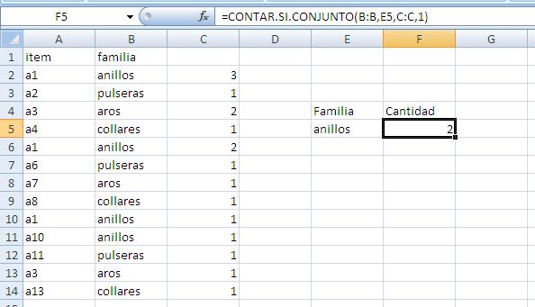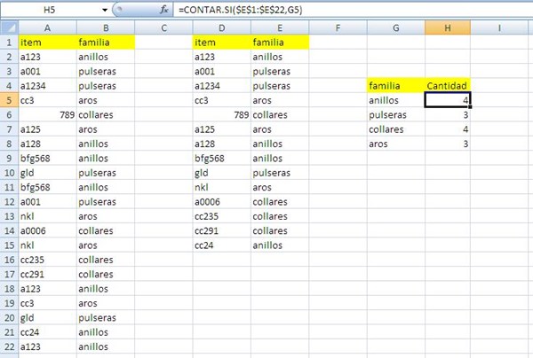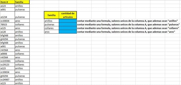 Necesito, por medio de una fórmula, contar los valores únicos del listado A2:A22, y que además, en el rango B2:B22 sean "anillos".
