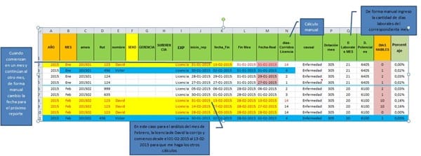 En una planilla voy registrando los datos mensuales de las personas con licencias. Dicha información se me entrega de un sistema con la fecha de inicio y término, independiente si pasa del mes anterior. Por lo mismo, para efecto de cálculo mensual requiero que en vez de ir revisando persona por persona si la fecha de término pasa al otro mes, se haga el corte automático de acuerdo a la fecha y me calcule los días que corresponden para dicho mes y dejar los días restantes para el análisis del próximo mes.
