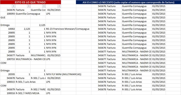 Así están mis datos lo que necesito es rellenar los campos que hay entre factura y factura con los datos del ultimo numero para que todos las líneas me digan a quien pertenece.
