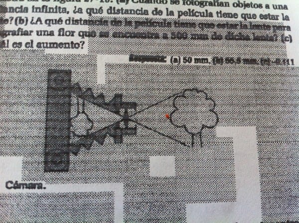 Problema 1: Una cámara esta provista de una lente convergente con longitud focal de 50mm, montada frente a una película sensible a la luz, como se muestra en la figura (que se muestra abajo). A) Cuando se fotografían objetos a una distancia infinita ¿A qué distancia de la película tiene que estar la lente? B) ¿A qué distancia de la película tiene que estar la lente para fotografiar una flor que se encuentra a 500 mm de dicha lente?. C)¿Cuál es el aumento?