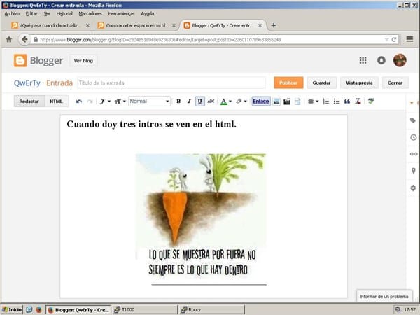 Hola Oriol Gil: Gracias por contestarme, lo primero que me solicita sinceramente no lo entiendo, solo entiendo " o las capturas". En cuanto a esto último le recuerdo que las capturas las tiene usted en un post de un poco más arriba, son dos, la de la pestaña "Redactar" y la de "HTML", ambas me las pidió Usted en una anterior respuesta a mi petición de ayuda, en la cual yo le decía que no aparecía <br> por ningún sitio.