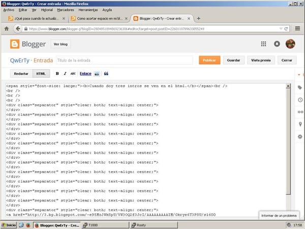 Hola GilOriol; Gracias por la nueva contestación a mi pregunta; pero no encuentro la forma de rectificar, a través del borrado de todas las <br> necesarias; pues no encuentro exactamente a donde tengo que entrar para hacer dicha corrección. Si sigo el enlace me lleva a una ventana llena de códigos raros, pero que ninguno de estos responde a <br>. Sin más por el momento, os envío un cordial abrazo.
