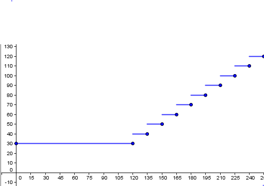 Estacionado dos horas o menos se le cobrará $30, si después de las dos horas permanece estacionado 15 minutos o menos se le cobrarán $10 más, si despues de las dos horas permanece más de quince minutos pero no excede media hora se le cobrará $20. Éste proceso sigue así en adelante, cada quince minutos extra se le cobrarán $10 más de lo que ya lleva acumulado.