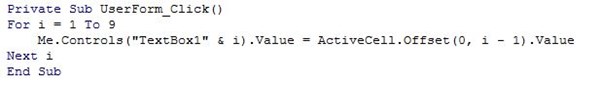 Me.Controls("TextBox" & i).Value = ActiveCell.Offset(0, i - 1).Value