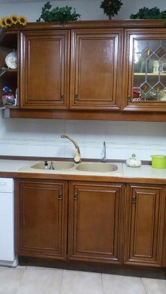 La cocina es antigua (15 años aprox) pero muy buena, de FORLADY, exteriores en ROBLE (que ya he barnizado varias veces) además por dentro los armarios aunque forrados con chapa de madera, pero esta tiene unos dibujitos color crema.
