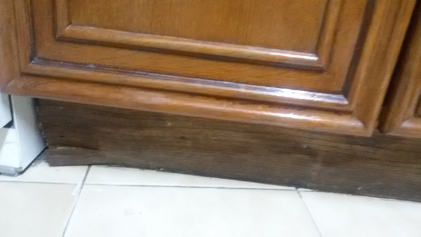 Se me ha estropeado la parte baja del mueble de cocina (es una madera que va del suelo al mismo mueble por dos lados pues hace angulo, como es la parte frontal, se vé mucho). Y es que se me estropeó el fregadero y salió bastante agua. Y esa parte del mueble de cocina, se ha hinchado y se ha estropeado.