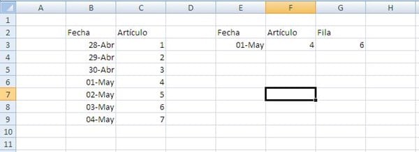 Hola, estoy necesitando saber cómo puedo encontrar la fila que contiene dos condiciones, por ejemplo quiero buscar la fila 11 que contiene en la columna B la fecha 01/05/2015 y en la columna C un artículo el número 4. La condición 1 es la fecha y la condición 2 es el artículo.