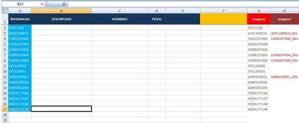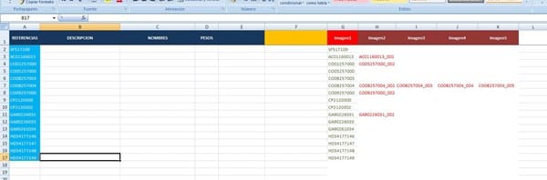 La segunda mejora es que me listase en es fichero, llamado Listado.xls, (del que adjunto imagen y proporciono a quien me lo pida), colocando los que haya encontrado con las terminaciones _002, _003, _004 y _005 en las celdas que te indico, pero sólo las que encuentre en el almacén con estas terminaciones, basándose en la columna G de este fichero, y colocándolas a partir de la columna H en la fila que corresponda con el nombre de la imagen.
