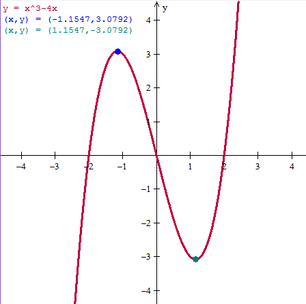 $$\begin{align}&f'(x) = 3x^2 - 4 =0\\&\\&3x^2 = 4\\&\\&x^2=\frac 43\\&\\&x=\pm \sqrt{\frac 43}= \pm \frac{2}{\sqrt 3}= \pm \frac{2 \sqrt 3}{3}\\&\\&f''(x) = 6x\\&\\&f''\left(\frac{2 \sqrt 3}{3} \right)=\frac{12 \sqrt 3}{3}=4 \sqrt 3\gt0\implies mínimo\\&\\&f''\left(-\frac{2 \sqrt 3}{3} \right)=-\frac{12 \sqrt 3}{3}=-4 \sqrt 3\gt0\implies máximo\\&\\&f\left(\frac{2 \sqrt 3}{3} \right)=\left(\frac{2 \sqrt 3}{3} \right)^3-4\left(\frac{2 \sqrt 3}{3} \right)=\frac 89 \sqrt 3-\frac 83 \sqrt 3=\\&\\&-\frac {16}{9} \sqrt 3\approx -3.0792\\&\\&f'\left(-\frac{2 \sqrt 3}{3} \right)= \frac {16}{9} \sqrt 3\approx 3.0792\text{ por simetría central}\\&\\&\text{máximo relativo } \left(-\frac{2 \sqrt 3}{3},\frac {16}{9} \sqrt 3 \right)\approx (-1.1547,\;3.0792)\\&\\&\text{mínimo realtivo }\left(\frac{2 \sqrt 3}{3},-\frac {16}{9} \sqrt 3 \right)\approx (1.1547,\;-3.0792)\\&\\&\text{Para intervalos de crecimiento o decrecimiento}\\&\\&\left(-\infty,-\frac{2 \sqrt 3}{3} \right) \text{creciente porque termina en máximo}\\&\\&\left(-\frac{2 \sqrt 3}{3},\frac{2 \sqrt 3}{3} \right) \text{decreciente porque termina en mínimo}\\&\\&\left(\frac{2 \sqrt 3}{3},\infty \right) \text{Creciente porque empieza en un mínimo}\\&\\&\\&\text{Para calcular puntos de inflexión, la derivada segunda es}\\&\\&f''(x)=6x =0\\&\\&x=0 \text{ es punto de inflexión es el (0,0)}\\&\\&\text{Para el tipo de concavidad}\\&\\&\text{Para x}\lt0\implies f''(x)\lt 0\implies \text{cóncava hacia abajo}\\&\\&\text{Para x}\gt0\implies f''(x)\gt 0\implies \text{cóncava hacia arriba}\end{align}$$Y la gráfica es: