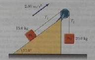 Dos bloques, como se muestra en la figura P10.71, están conectados mediante una cuerda de masa despreciable que pasa sobre una polea de 0.250 m de radio y momento de inercia I. El bloque sobre el plano inclinado sin fricción se mueve hacia arriba con una aceleración constante de 2.00 m/s2. A) Determine T1 y T2, las tensiones en las dos partes de la cuerda. B) Encuentre el momento de inercia de la polea.