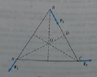 Dos fuerzas F1 y F2 actúan a lo largo de dos lados de un triangulo equilátero como se muestra en la figura, el punto 0 esta en la intersección de las altitudes del triangulo, encuentre una tercera fuerza F3 a aplicar en B y a lo largo de BC que haga cero el par de torsión total alrededor del punto 0 ¿qué pasa si? ¿Cambiara el par de torsión total si F3 se aplica no en B sino en cualquier otro punto a lo largo de BC?