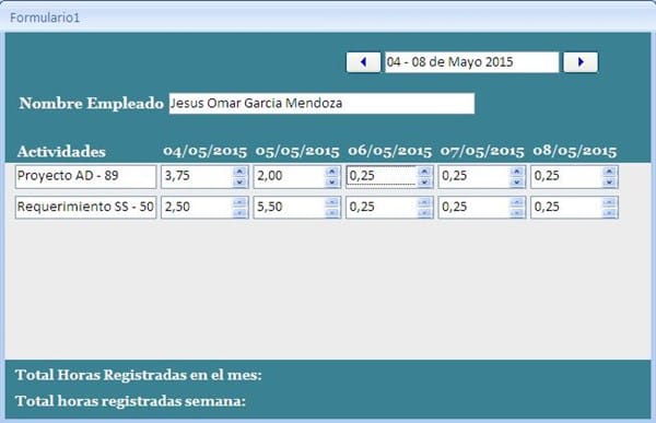 Buenas tardes expertos, acudo nuevamente a usted ya que en mi pregunta anterior estaba planteando mal la vista del formulario, el mismo seria de esta manera: Requiero poder desplazarme en una rango de una semana y que al ubicarme por ejemplo en el rango 04 - 08 de Mayo 2015 este vaya asignando las fechas a lo que se supone son los días de la semana Lunes 04/05/2015 martes 05/05/2015 miércoles 06/05/2015...y así sucesivamente y que las casillas debajo de las fecha me permitan ingresar las horas trabajadas para la fecha que se encuentra arriba de este.