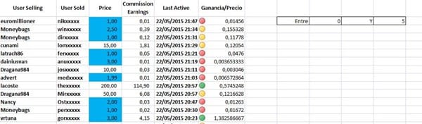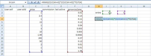 Yo quiero hacer en excel que me busque el valor máximo de la columna ganancias/precio, pero en un rango especifico de la columna price(y que ese rango se pueda variar como aparece a la derecha en las celdas "entre... Y..."). No se si se puede hace o es una tontería, la verdad es que no tengo mucha idea de excel
