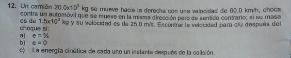 $$\begin{align}&e= – \frac{V_{f2} – V_{f1}}{V_{i2} – V_{i1}} \\&\\&\frac 34=-\frac{V_{f2} – V_{f1}}{-25-\frac{50}{3}}=\frac{V_{f2} – V_{f1}}{\frac{125}{3}}\\&\\&V_{f2}-V_{f1}=\frac{125}{4}=31.25 m/s\\&\\&\text{Por conservación del momento lineal}\\&\\&m_1·V_{i1}+m_2·V_{i2}= m_1·V_{f1}+m_2·V{f_2}\\&\\&20000·\frac{50}{3}+1500·(-25) = 20000V_{f1}+1500V_{f2}\\&\\&\frac{1000000}{3}-37500 = 20000V_{f1}+1500V_{f2}\\&\\&\frac{887500}{3}= 20000V_{f1}+1500V_{f2}\\&\\&600V_{f_1}+45V_{f2} = 8875\\&\\&\text {De la ecuación del coeficiente de restitución despejamos}\\&V_{f2}=31.25+V_{f_1}\\&\\&\text{para sustituir en la de conservación del momento lineal}\\&600V_{f1}+45(31.25+V_{f1})=8875\\&\\&600V_{f_1}+ 1406.25 +45V_{f_1} = 8875\\&\\&645V_{f1} = 7468.75\\&\\&V_{f1}=\frac{7468.75}{645}= 11.57945736\,m/s\\&\\&Vf_2= 31.25+V_{f_1}=42.82945736\,m/s\\& \\&\end{align}$$