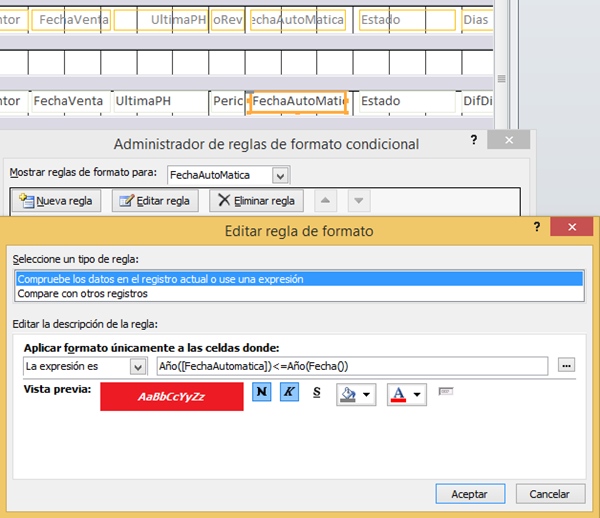 Formato condicional de un campo teniendo en cuenta valor de otro campo en informes access 2013