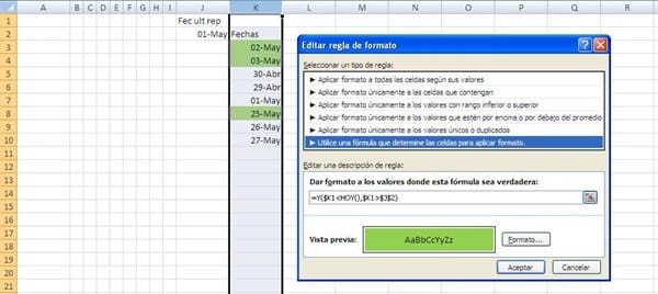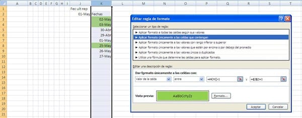 Quiero resaltar (con formato condicional) un intervalo de fechas.