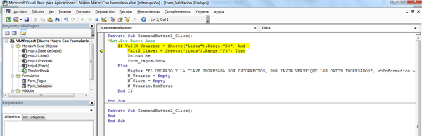 La consulta que te traigo esta vez es como validar un usuario utilizando un formulario en el cual debe ingresar un nombre de usuario y una calve para poder acceder a otro formulario los nombre de usuario y clave están en una hoja del mismo libro llamada listas, ya cree el formulario e intente crear la condición para que funcione pero la instrucción se detiene al ejecutar la función