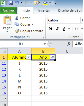 Lo malo es que la fila 2 esta oculta y yo quiero posicionarme en la fila 2 de columna año que tengo filtrado. La fila subsiguiente del campo año es el numero 11. Pero no puedo ponerle un numero 11 porque no siempre existirán la misma cantidad de registros. Como podría hacer.?