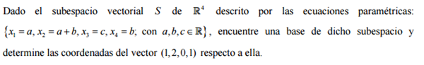 Las ecuaciones 1, 3 y 4 ya nos proporcionan las coordenadas, no obstante debemos comprobar que se cumple la segunda, ya que si no se cumpliera no sería un vector del subespacio S