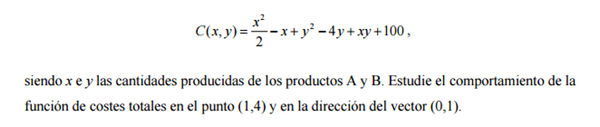 $$\begin{align}&C(x,y) =\frac{x^2}{2}-x+y^2-4y+xy+100\\&\\&C(1,4)=\frac 12-1+16-16+4+100 = 103.5€\\&\\&I(1,4)=30+4·50=230€\\&\\&U(1,4) = 230-103.5 = 126.5€\\&\\&\text{calculamos las derivadas parciales}\\&\\&\frac{\partial C(x,y)}{\partial x}=x-1+y\\&\\&\frac{\partial C(x,y)}{\partial y}=2y-4+x\\&\\&\nabla C_{(1,4)}=(1-1+4, 8-4+1) = (4,5)\\&\\&\text{La derivada direccional de los costes con u=(0,1) es}\\&\\&(4,5)·(0,1) = 4·0+5·1 = 5\end{align}$$Que quiere decir que una vez que se fabrican 1 unidad de A y 4 de B, los costes crecen en 5€ por cada unidad más de B que se produce.