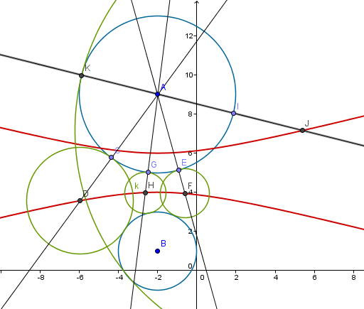 $$\begin{align}&d[(h,k),(-2,1)]=r+2\\&d[(h,k),(-2,9)] = r+4\\&\\&\sqrt{(h+2)^2+(k-1)^2}=r+2\\&\sqrt{(h+2)^2+(k-9)^2}=r+4\\&\\&(h+2)^2+(k-1)^2 = (r+2)^2\quad (^*)\\&(h+2)^2 +(k-9)^2 = (r+4)^2\\&\\&\text{despejando }(h+2)^2 \text{en las dos}\\&\text{e igualando}\\&\\&(r+2)^2-(k-1)^2=(r+4)^2-(k-9)^2\\&\\&r^2+4r+4-k^2+2k-1=r^2+8r+16-k^2+18k-81\\&\\&4r +2k+3 = 8r+18k-65\\&\\&4r+16k-68=0\\&\\&r=17-4k\\&\\&\text{lo sustituimos en *}\\&\\&(h+2)^2+(k-1)^2 = (17-4k+2)^2\\&\\&(h+2)^2+(k-1)^2 = (19-4k)^2\\&\\&(h+2)^2+k^2-2k+1-16k^2+128k-361=0\\&\\&(h+2)^2-15k^2+126k-360 =0\\&\\&(h+2)^2 - 15\left(k^2-\frac{126}{15}k-24\right)=0\\&\\&(h+2)^2-15\left(\left(k-\frac {63}{15} \right)^2-\frac{63^2}{15^2}-24\right)=0\\&\\&(h+2)^2-15\left(k-\frac {63}{15} \right)^2=15\left(\frac{1041}{25} \right)=\frac {3123}{5}\\&\\&(h+2)^2-\frac{\left(k-\frac {63}{15} \right)^2}{\frac 1{15}}=\frac {3123}{5}\\&\\&\frac{(h+2)^2}{\frac{3123}{5}}-\frac{\left(k-\frac {63}{15} \right)^2}{\frac {1041}{25}}=1\\&\\&\frac{(h+2)^2}{\left(\sqrt{\frac{3123}{5}}\right)^2}-\frac{\left(k-\frac {63}{15} \right)^2}{\left(\frac {\sqrt{1041}}{5}\right)^2}=1\\&\end{align}$$