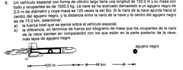 $$\begin{align}&F=G·120·(masa\;sol)\int_{15000}^{15120}\frac{dm}{x^2}\\&\\&\text{la masa de la nave por metro es}\\&\\&\frac{1500kg}{120m}= 12.5kg/m\\&\\&\text{el diferencial de masa es}\\&12.5 kg\;dx\\&\text{Sacamos fuera de la integral la constante y las }\\&\text{unidades de medida que también son constantes}\\&\\&F=G·120·(masa\;sol)·12.5kg/m^2\int_{15000}^{15120}\frac{dx}{x^2}=\\&\\&G·(masa \;sol)·1500kg/m^2·\left[-\frac 1x \right]_{15000}^{15120}=\\&\\&G·(masa \;sol)·1500kg/m^2 \left(\frac 1{15000}-\frac 1{15120} \right)\approx\\&\\&G·(masa \;sol)·7.936507937·10^{-4}\,kg/m^2\approx\\&\\&6.67384·10^{-11}\frac{N·m^2}{kg^2}·1.9891·10^{30}kg·7.936507937·10^{-4}\frac {kg}{m^2}\approx\\&\\&1.053566281 · 10 ^{18} N\end{align}$$