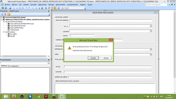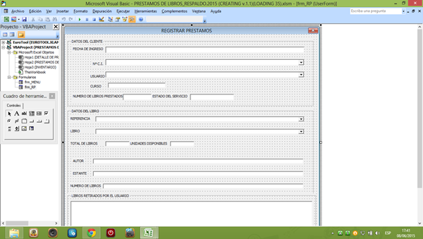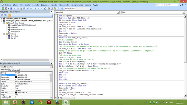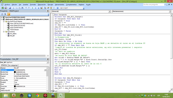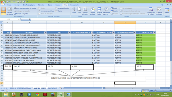 Y dependiendo del cbm_NCI se filtraria los datos para optener el detalle de cuantos libros posee el usuario, el detalle de esto se colocaría dentro listbox lst_LRU que se encuentra dentro de la Frame Libros Prestados por el usuario (aquí están las 13 columnas). La base de datos para este listbox es la hoja DETALLES DE PRESTAMOS.exe, de la misma llamaríamos al UserForm principal