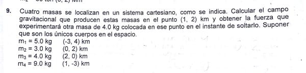 Lo que veo hecho es el cálculo de los vectores unitarios de la fuerza que ejerce cada masa en el punto (1, 2) km, pero el cuarto vector está mal, es 5j.