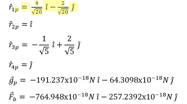 $$\begin{align}&\vec g_{1p}=k·\frac{5}{20}·\frac{1}{\sqrt {20}}\left( 4\vec i-2\vec j \right)\approx\\&\qquad k·(0.2236067977\vec i - 0.1118033989\vec j)\\&\\&\vec g_{2p}=k·3\vec i\\&\\&\vec g_{3p}=k·\frac{4}{5}·\frac{1}{\sqrt 5}(-\vec i+2\vec j)\approx\\&\qquad k·(-0.3577708764\vec i + 0.7155417528\vec j)\\&\\&\vec g_{4p}= k·\frac{9}{25}\vec j\\&\\&\text{Ahora sumo los cuatro vectores}\\&\\&\vec g_p =k(2.865835921\vec i, 0.96373835394\vec j)\\&\\&\text{recordemos que}\\&\\&k=G·10^{-6}=6.67384·10^{-17}\\&\\&\vec g_p =1.92261304·10^{-15}\frac N{kg}\; \vec i+6.431835576·10^{-16} \frac{N}{kg}\;\vec j\\&\\&\text {Y la fuerza es eso mismo multiplicado por 4}\\&\\&\vec F_b=7.69045216·10^{-15}N\;\vec i+2.57273423·10^{-15} N\vec j\\&\\&\end{align}$$Y eso es todo, los resultados que había difieren ligeramente el algún decimal y sobre todo en el signo, el que he puesto yo es el auténtico.