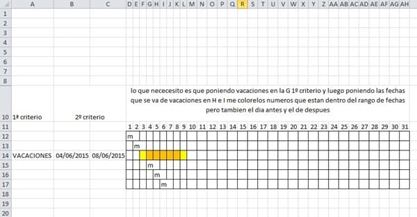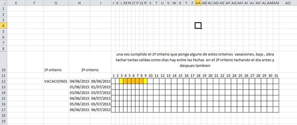 Hola, agradeceria ayuda en la siguiente cuestion para hacer formato condicional sobre las celdas numeradas del 1 al 31 una vez cumplido el 1º criterio que ponga alguno de estos criterios vacaciones, baja, obra, tachar tantas celdas como dias hay entre las fechas en el 2º criterio tachando el dia antes y despues tambien