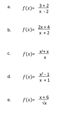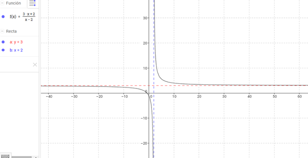 $$\begin{align}&a) f(x)=\frac{3x+2}{x-2} \mbox{ (supongo que es así, sino avisa ya que no tiene sentido 3+2)}\\&\mbox{Dom: todos los puntos donde está definida la función, los polinomios están definidos para todo R}\\&\mbox{así que solo queda ver los puntos donde se anula el denominador que sería cuando x-2=0, o sea}\\&\mbox{cuando x=2}\\&\mbox{Rango: para esto tenemos que ver los posibles valores de la función}\\&\mbox{ya sabemos que para x=2 no está definida, y tiene una asintota vertical, haciendo abuso de notación}\\&\lim_{x \to 2^+}\frac{3x+2}{x-2} \to \frac{8}{0^+}\to +\infty\\&\lim_{x \to 2^-}\frac{3x+2}{x-2} \to \frac{8}{0^-}\to -\infty\\&\mbox{Ahora veamos los límites cuando x tiende a infinito}\\&\lim_{x \to +\infty}\frac{3x+2}{x-2} \to \frac{3(+\infty)}{+\infty} \to +3\\&\lim_{x \to -\infty}\frac{3x+2}{x-2} \to \frac{3(-\infty)}{-\infty} \to +3\\&\mbox{Veamos si f(x) = 3 para algún valor de x}\\&3=\frac{3x+2}{x-2}\\&3(x-2)=3x+2\\&3x-6=3x+2\\&-6=2 \mbox{ Absurdo!, luego 3 no pertenece al Rango de f(x)}\\&\mbox{Análicemos la derivada}\\&a) f'(x)=\frac{3}{(x-2)} -\frac{(3x+2)}{(x-2)^{2}}=\frac{3(x-2)-(3x+2)}{(x-2)^{2}}=\frac{3x-6-3x-2}{(x-2)^{2}}=\frac{-8}{(x-2)^{2}}\\&\mbox{Para el Dom f está siempre definida y es siempre menor que cero, así que la función es estricatamente}\\&\mbox{decreciente}\\&\mbox{De todo lo anterior podemos concluir que el rango es R -{3}}\\&\end{align}$$Inicialmente iba a hacer también la b) pero, como ves, llevó demasiado trabajo. Te dejo además la imagen de la función anterior donde te marco las dos asíntotas que tiene