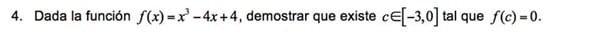 Se cumplen las condiciones y por aplicación del teorema hay un punto c en (-3, 0) tal que f(c)=0