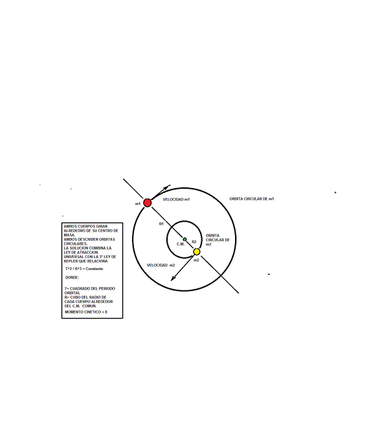 $$\begin{align}&G\cfrac{m_{1}m_{2}}{d^{2}}=m_{1}a_{c1}\Rightarrow G\cfrac{{m_{1}}m_{2}}{d^{2}}={m_{1}}\omega^{2}r_{1}\end{align}$$$$\begin{align}&\cfrac{m_{1}m_{2}}{d^{2}}=m_{2}a_{c2}\Rightarrow G\cfrac{m_{1}{m_{2}}}{d^{2}}={m_{2}}\omega^{2}r_{2}\end{align}$$Donde r1 y r2 son las distancias de m1 y m2 al centro de masas, respectivamente.