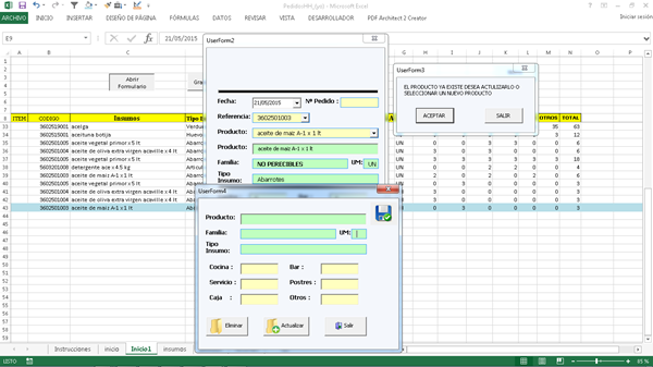 Estoy elaborando un formulario en Excel para pedidos de áreas en la cual utilizo un formulario para cargar mi base de datos en la cual no quiero tener productos repetidos y si hay productos repetidos que estos productos se carguen a otro formulario para actualizar el producto o lo pueda eliminar.
