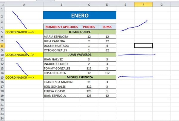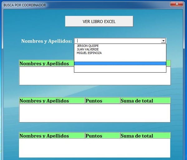 En este caso esta en el primero Coordinador JERSON QUISPE entonces en el ListBox 1 debe copiar sus trabajadores "desde MARIA ESPINOZA hasta OTTO GONZALES" con sus puntos y suma. En caso de no encontrar el nombre no Mostrar nada en el list box.