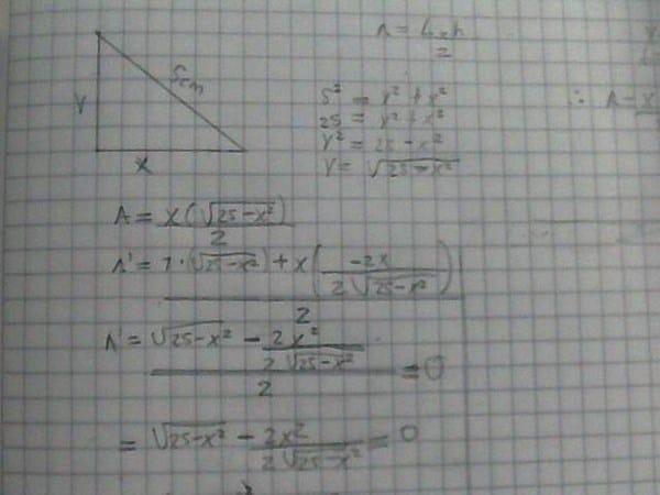 $$\begin{align}&\text{De la figura del triàngulo:}\\&\\&5^2=x^2+y^2,\ \text{despejamos y tenemos:}\ y=\sqrt{25-x^2}\\&\\&\text{luego, el àrea del triàngulo efectivamente es (x*y)/2}, \text{sustituimos x en la fòrmula del àrea:}\\&\\&A=\frac{x*\sqrt{25-x^2}}{2},\text{ahora aquì te va un trucazo :)}\\&\text{maximizar A equivale a maximizar}\ A^2\ \ entonces:\\&\\&A^2=\frac{x^2*(25-x^2)}{4}=\frac{25x^2}{4}-\frac{x^4}{4}\\&\\&\text{luego si}A^2=f(x) \ \ entoncesf(x)=\frac{25x^2}{4}-\frac{x^4}{4} \text{es la funciòn a maximizar.}\ \ \text{vaya que esto ahorra muchas cuentas :D}\\&\\&\text{luego, los pasos para maximizar la funciòn son los siguientes:}\\&\\&\text{paso 1:}\\&\text{derivamos f(x), entonces:}\\&f`(x)=\frac{25(2x)}{4}-\frac{4x^3}{4}=\frac{25x}{2}-x^3\\&\\&\text{paso 2:}\\&\text{ La derivada se iguala a cero y se determinan los valores crìticos.}\\&f`(x)=0,\ entonces\ \frac{25x}{2}-x^3=0\\&\text{de donde:}\ \ x_{1}=\frac{-5\sqrt{2}}{2},x_{2}=\frac{5\sqrt{2}}{2} y\ \ x_{3}=0\\&\\&\text{paso 3:}\\&\text{se evalùan los valores crìticos en la segunda derivada para determinar los màximos de la funciòn:}\\&f``(x)=\frac{25}{2}-3x^2\\&\text{entonces para:}\\&x_{1}=\frac{-5\sqrt{2}}{2},\ \ f``(\frac{-5\sqrt{2}}{2})=-25<0\ \ màximo\\&\\&x_{2}=\frac{5\sqrt{2}}{2},\ \ f``(\frac{5\sqrt{2}}{2})=-25<0 \ \ màximo\\&\\&x_{3}=0,\ \ f``(0)=\frac{25}{2} >0\ \ mìnimo\\&\\&\text{entonces, ya sea para x1 o x2, el àrea es màxima, luego sustituyendo en la ecuaciòn de pitàgoras:}\\&\\&25=(\frac{5\sqrt{2}}{2})^2+y^2,\ \ entonces: y=\frac{5\sqrt{2}}{2}\\&\\&\text{Por lo tanto, los valores que haràn el àrea màxima son:}\\&\\&x=\frac{5\sqrt{2}}{2}, y=\frac{5\sqrt{2}}{2}\\&\\&\\&\\&\\&\end{align}$$y listo!
