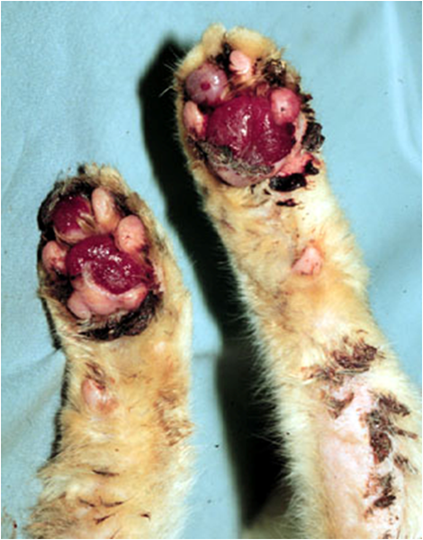 Buscando en google «feline lupus erythematosus foot pads» he encontrado esta foto, que aparece como una especie de problema de cuestionario, en un material de veterinaria en línea (me he tenido que inscribir):