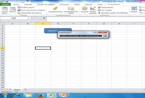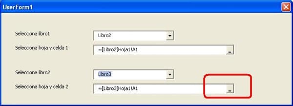 Private Sub ComboBox1_Change() 'Por.Dante Amor hoja = Workbooks(ComboBox1.Value).Sheets(1).Name RefEdit1 = "=[" & ComboBox1 & "]" & hoja & "!A1" End Sub ' Private Sub ComboBox2_Change() 'Por.Dante Amor hoja = Workbooks(ComboBox2.Value).Sheets(1).Name RefEdit2 = "=[" & ComboBox2 & "]" & hoja & "!A1" End Sub ' Private Sub UserForm_Activate() 'Por.Dante Amor For Each l In Workbooks ComboBox1.AddItem l.Name ComboBox2.AddItem l.Name Next End Sub ' Private Sub ComboBox1_KeyPress(ByVal KeyAscii As MSForms.ReturnInteger) KeyAscii = 0 End Sub