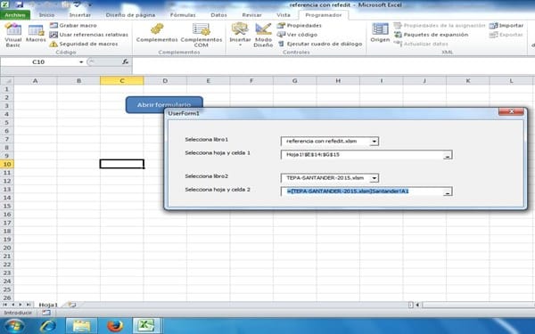 Private Sub ComboBox1_Change() 'Por.Dante Amor hoja = Workbooks(ComboBox1.Value).Sheets(1).Name RefEdit1 = "='[" & ComboBox1 & "]" & hoja & "'!A1" End Sub ' Private Sub ComboBox2_Change() 'Por.Dante Amor hoja = Workbooks(ComboBox2.Value).Sheets(1).Name RefEdit2 = "='[" & ComboBox2 & "]" & hoja & "'!A1" End Sub ' Private Sub UserForm_Activate() 'Por.Dante Amor For Each l In Workbooks ComboBox1.AddItem l.Name ComboBox2.AddItem l.Name Next End Sub ' Private Sub ComboBox1_KeyPress(ByVal KeyAscii As MSForms.ReturnInteger) KeyAscii = 0 End Sub